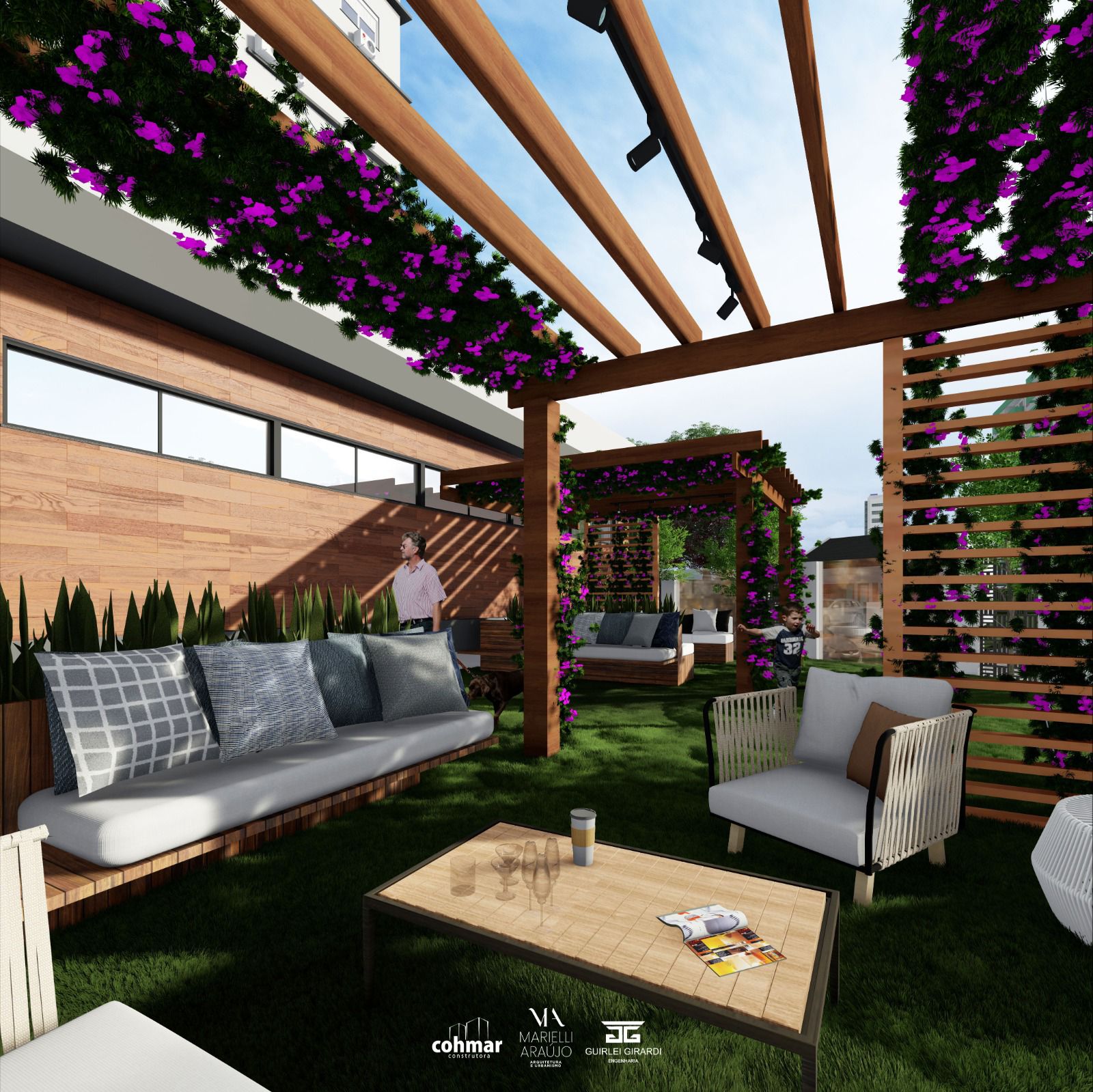 fas fa-tree Espaço garden de 100,50 m² com pergolado, lareira externa e jardin de especiárias